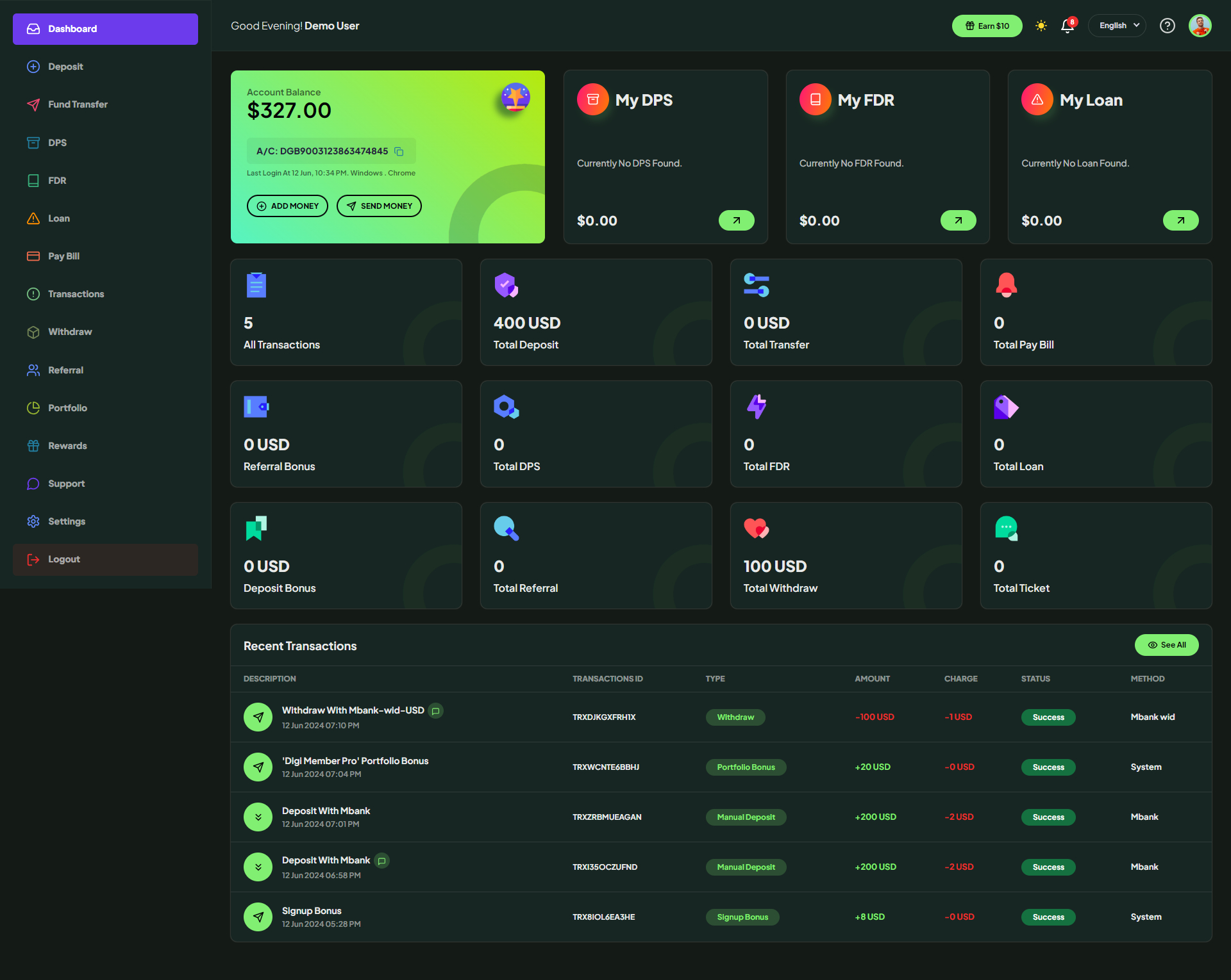 In the system, visitors can register as a bank user to the application and deposit into the account, and also can make the FDR or DPS using the deposited amount. In the system, there are DPS, FDR, Loan and Bill payment, Multi Wallets or Currency, and Virtual card creation features available. The user can make a DPS for a particular time period and amount, and can receive the DPS amount with the profit after its maturity. It is also possible to make FDR, which had some FDR plans, the bank users would keep the funds in their FDR as block money, and they would receive the profit from that money every a little period of time. FDR has the compounding system available. The bank users can also apply for a Loan by following all the processes of the bank. The admin or bank owner will be able to approve the loan or reject it if it does not fulfill the requirements.